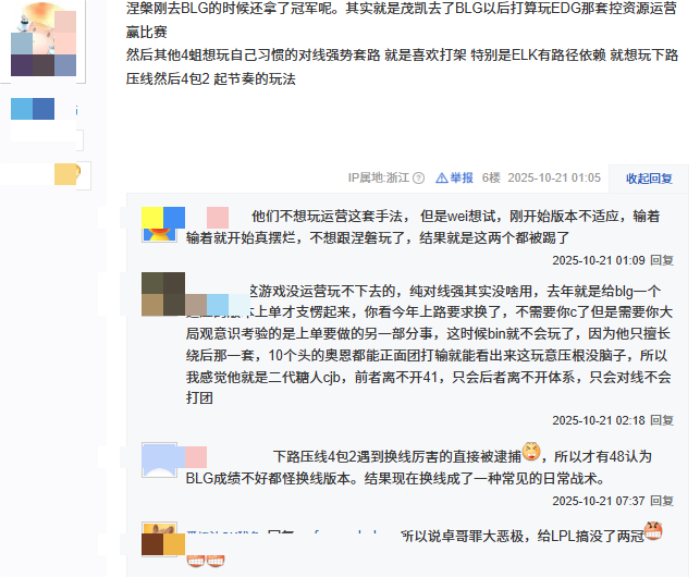 那个教练茂凯,上来就想把EDG那套运营打法直接套过来,上半年版本也还行,虫子那些英雄能用,可BLG这三个人骨子里就喜欢对线打架,主动找事,bin资源团的时候自己跑去带线,队友把资源一放他突然一个TP下来,三个C位对线期就送节奏,一到转线期就顶不住,后期又一个比一个敢送。