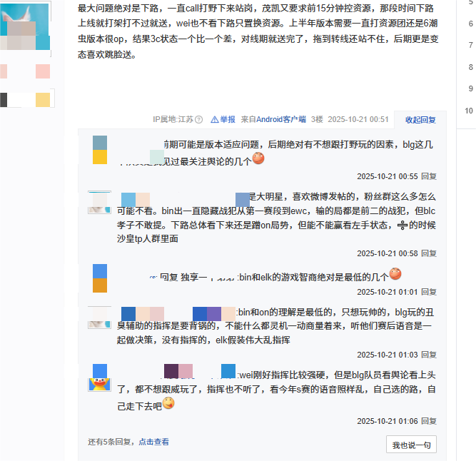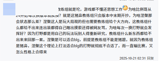 战术跟选手完全是两张皮,管理层也不出来说句话,队里有矛盾没人管,指挥要么没人说要么没人听,外面的风言风语也没人挡,涅槃还得替教练背锅,孤立无援,BLG去年换了xun,今年又换掉涅槃,那个核心的协作问题根本就没碰过。