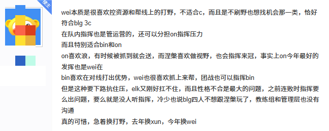 一说起BLG那堆事儿,很多人就想到涅槃,他刚来那会儿,网上都觉得是最后一块拼图,打法跟BLG那几个人简直绝配,bin那人就喜欢在线上打出花来,涅槃就帮他把野区资源看住,打团的时候还能喊住bin别太冲动,下路on的风格又飘,老是给机会,涅槃一来视野给得足,指挥也清晰,on整个人的状态都上来了,指挥的担子也轻了,那段时间BLG确实是拿了冠军的,涅槃干了多少活明眼人都看得到。