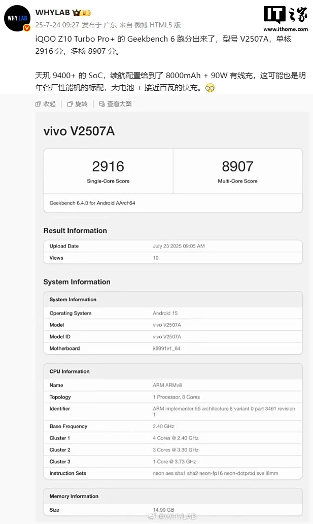 IT之家 7 月 24 日消息,一款型号为 V2507A 的 vivo 新机昨日现身 Geekbench 跑分平台,博主 @WHYLAB 透露该机为 iQOO Z10 Turbo Pro+。